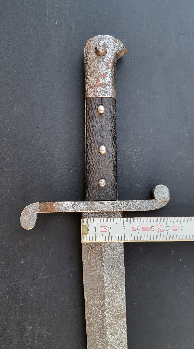 Ich habe dieses Jatagan-Bjonett bekommen, aber kann es leider nicht bestimmen. Das Besondere an dem Stück ist die zweischneidige Klinge mit Mittelgrat, was man so eigentlich von einem Jatagan nicht kennt. Die Gesamtlänge beträgt 705mm, die Klingenlänge 580 mm, die Klingenbreite 30 mm, die Klingenstärke 7 mm, Durchmesser des Laufringes 19,5 mm.