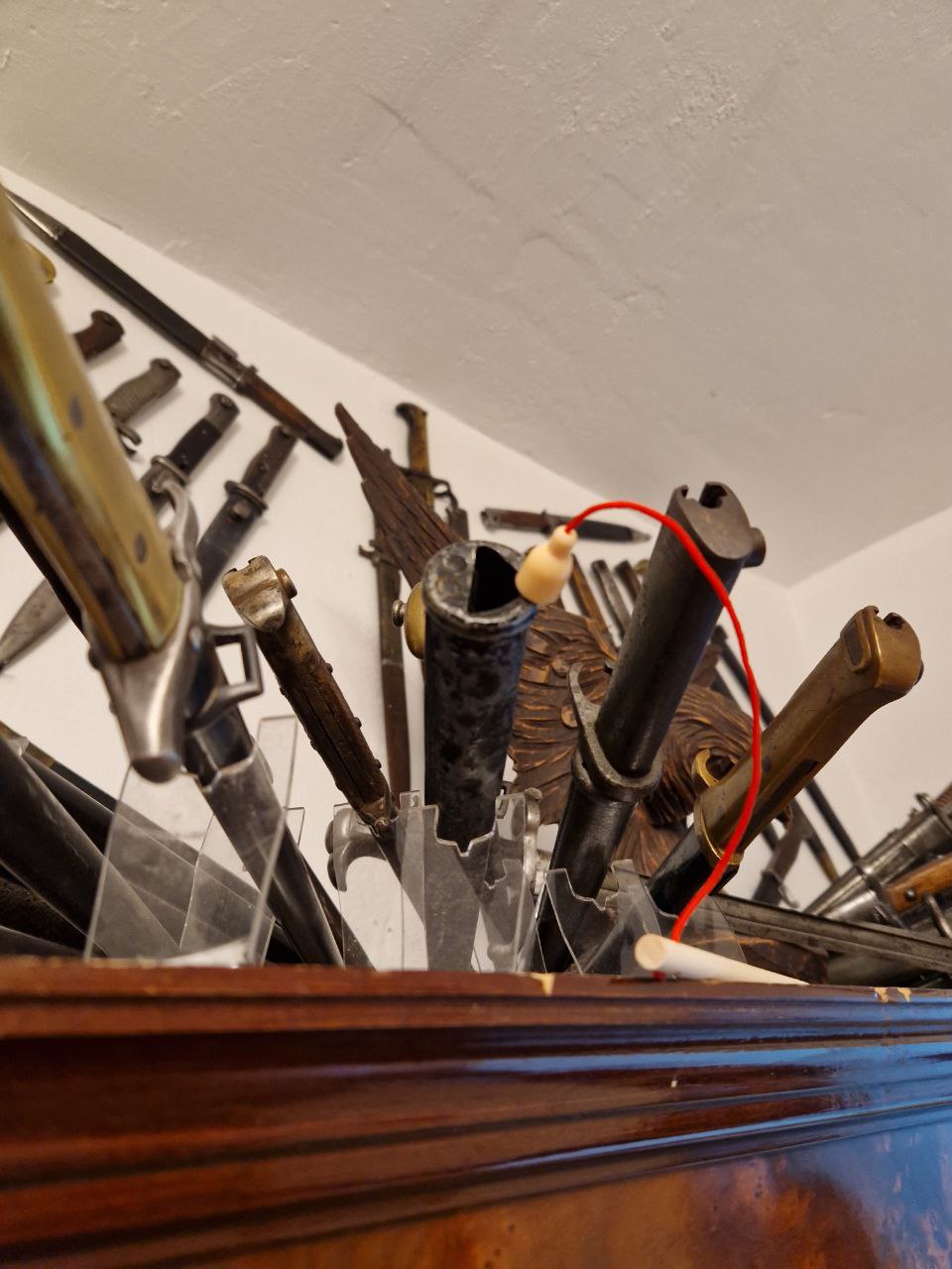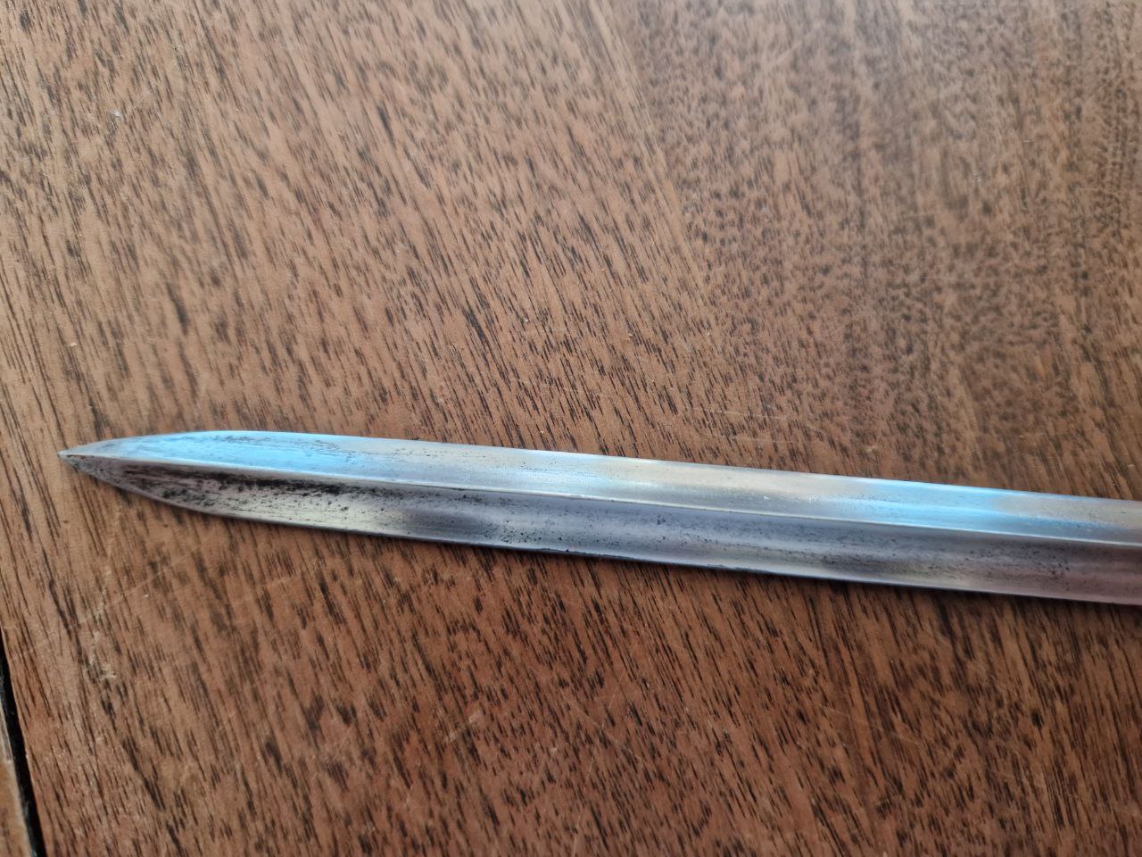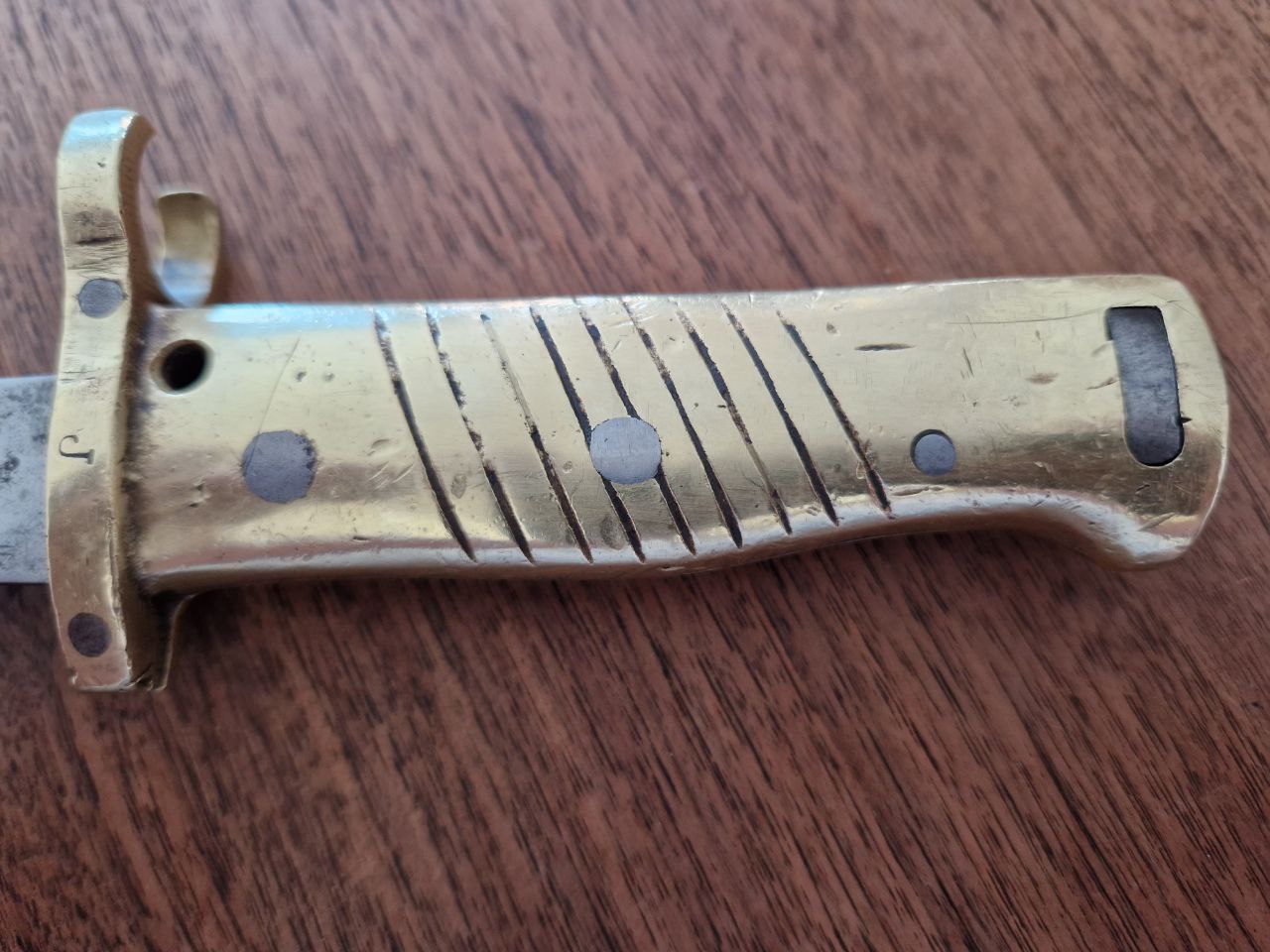 Schoenes ASG88/98 mit messing griff, das griff wurde wohl polliert auch die klinge, klinge stammt von Duellen bajonett, leider nicht mehr sichtbar die stempelung am klinge. Sollte fruhe periode sein,als messing weiters als strategisches Material behandelt wurde. Scheide wurde schwarz angemalt.