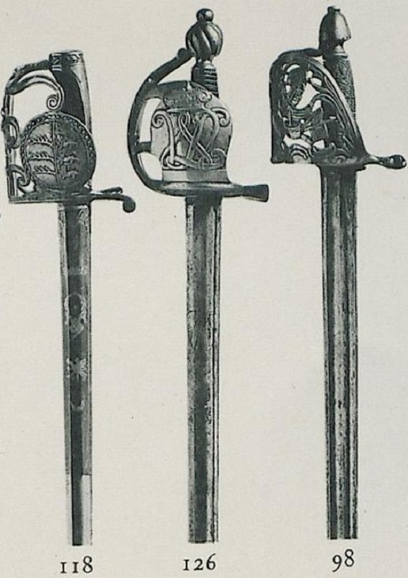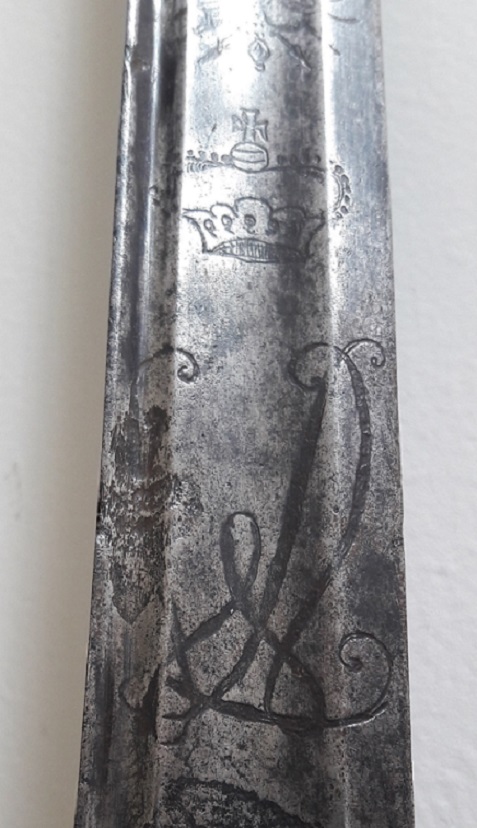 Gesamtlänge 105 cm, Klingen- 87,5 cm, Klingenbreite an der Fehlschärfe 3 cm, Klingendicke 8 mm. Leicht gebogene Klinge à la montmorency; auf 22 cm ab der Angel beiderseits und im Rücken mit Ätzungen, u. a. der Chiffre „WL“ unter der Landgrafenkrone versehen. Die von G. Große-Löscher vorgestellte Waffe hat eine 93 cm lange Klinge mit Rückenspitze, beim hier vorgestellten Exemplar wurde relativ unprofessionell eine Mittelspitze zurechtgeschliffen. Dies kann durchaus in der Tragezeit geschehen sein, da man um 1800 zu Mittelspitzen überging, mit denen man gezieltere Stiche anzubringen hoffte.