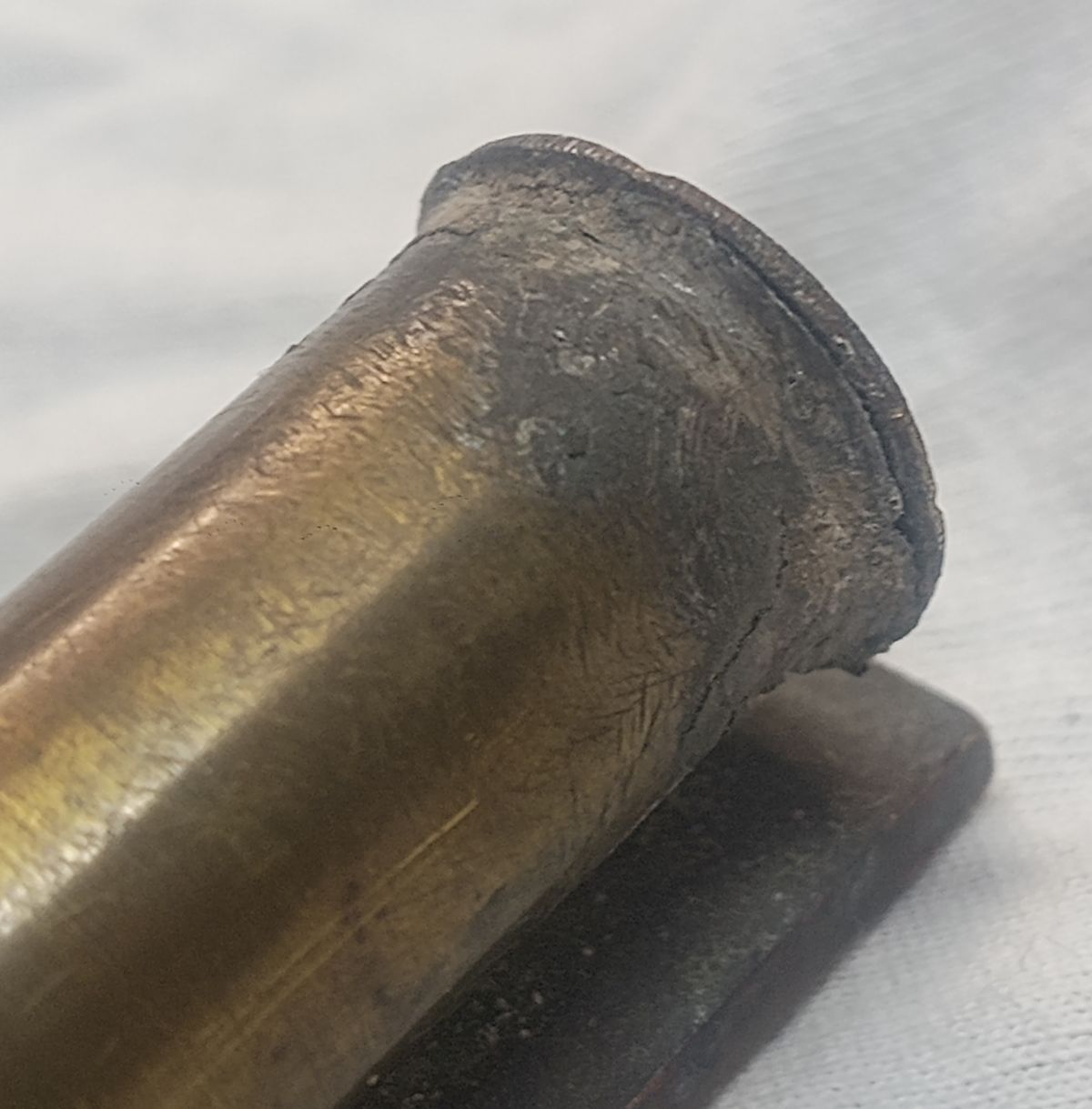 Die Enden des Messinggehäuses sind verlötet. Leider fehlt die Verschlusskappe von der Hülle. Aber, dass ist Jammern auf hohem Niveau.