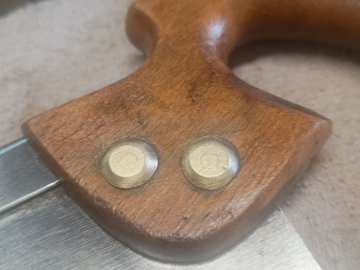 Die beiden Verbindungen haben sich "leider" als Nieten entpuppt. Ich hatte auf Schrauben gehofft, um die Säge für die Auffrischung zu zerlegen. Die Nieten aufmachen hat nicht funktioniert. Das Messing ist hart wie Stahl und ich wollte keinen Schaden riskieren. So musste ich umständlich drum herum putzen und Polieren.