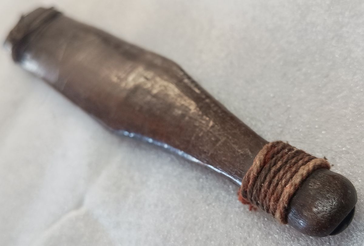 Die Hilze ist ebenfalls aus Holz, Äußerlich ohne erkennbare Angelbefestigung. Wahrscheinlich wurde die Angel eingebrannt und mit etwas unbekanntem verklebt.
