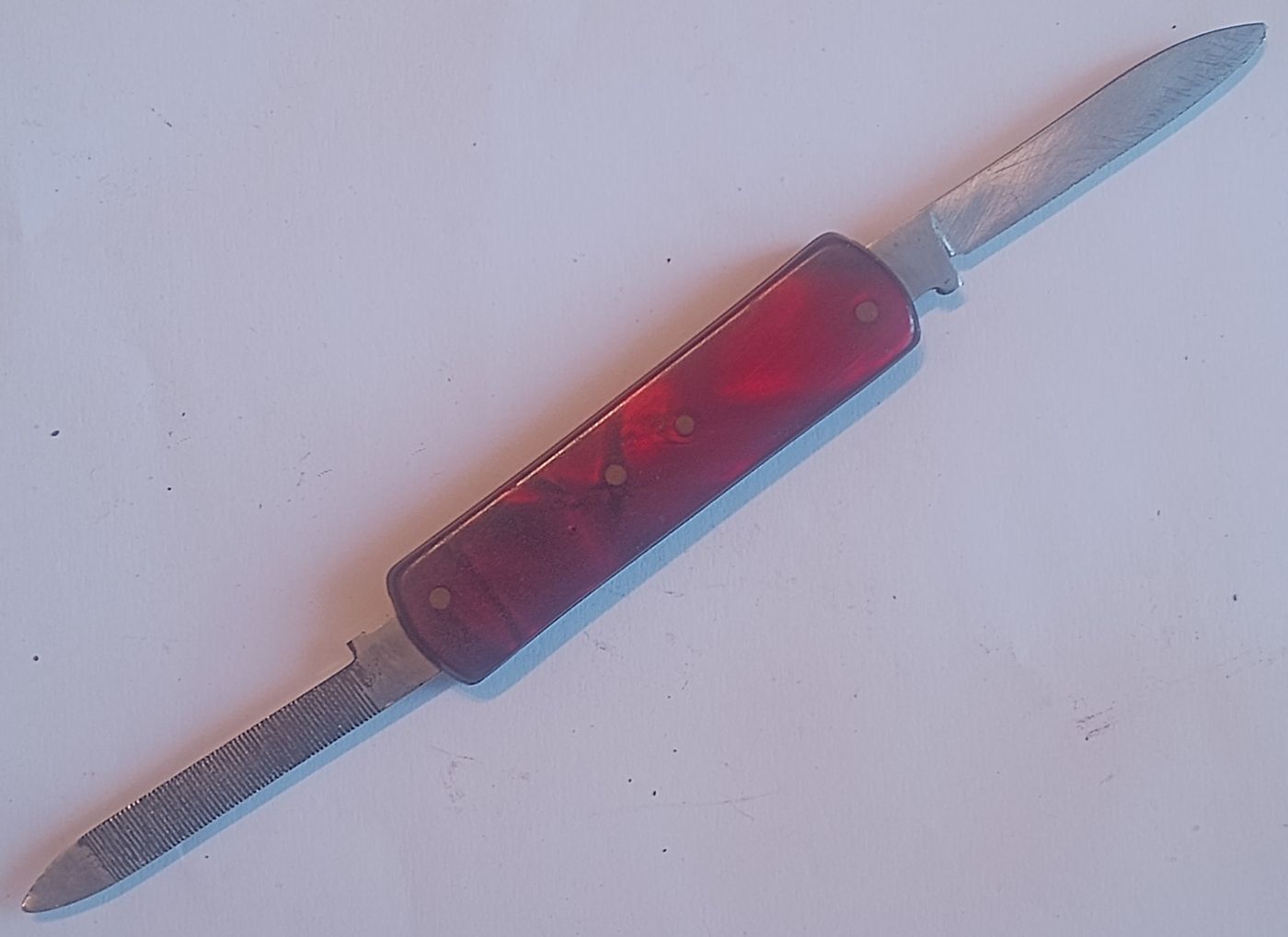 Dieses hübsche Taschenmesser ist leider defekt. Die Nagelfeile hat keinen Halt mehr, weil die dahinterstehende Feder weggebrochen ist.