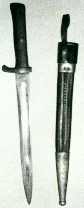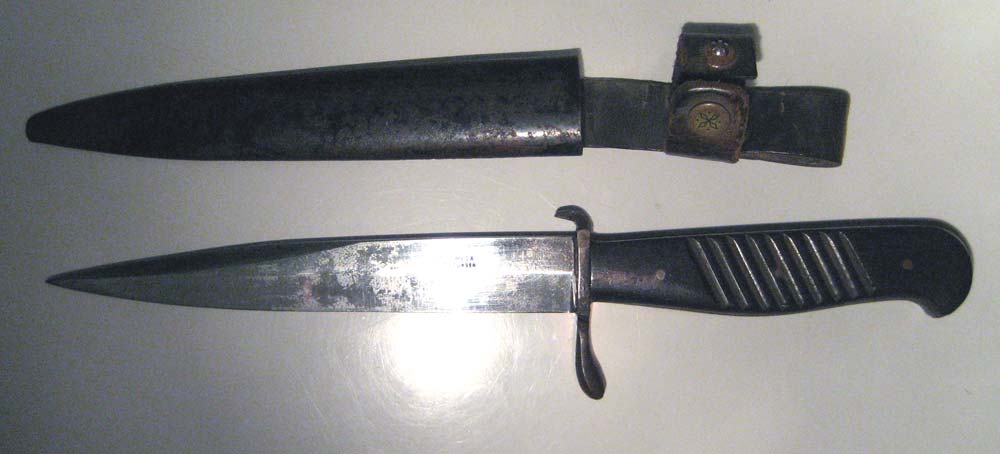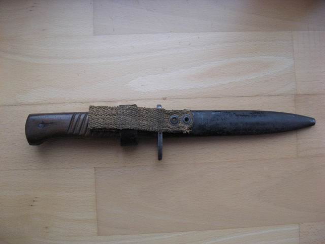 Ein interessantes Thema. Hier einmal Bilder aus der Vergangenheit. Vor über 30 Jahren in Koblenz erworben. Ein völlig in der Metallscheide (mit deutschem Tragehaken ähnlich dem 98/05 / auf dem Foto leider kaum sichtbar!) festgerostetes Messer. Die Kupfernieten sind original, die "kreuzförmigen" Einkerbungen leider meine Arbeit nach Anbringen der neuen Holzgriffschalen.