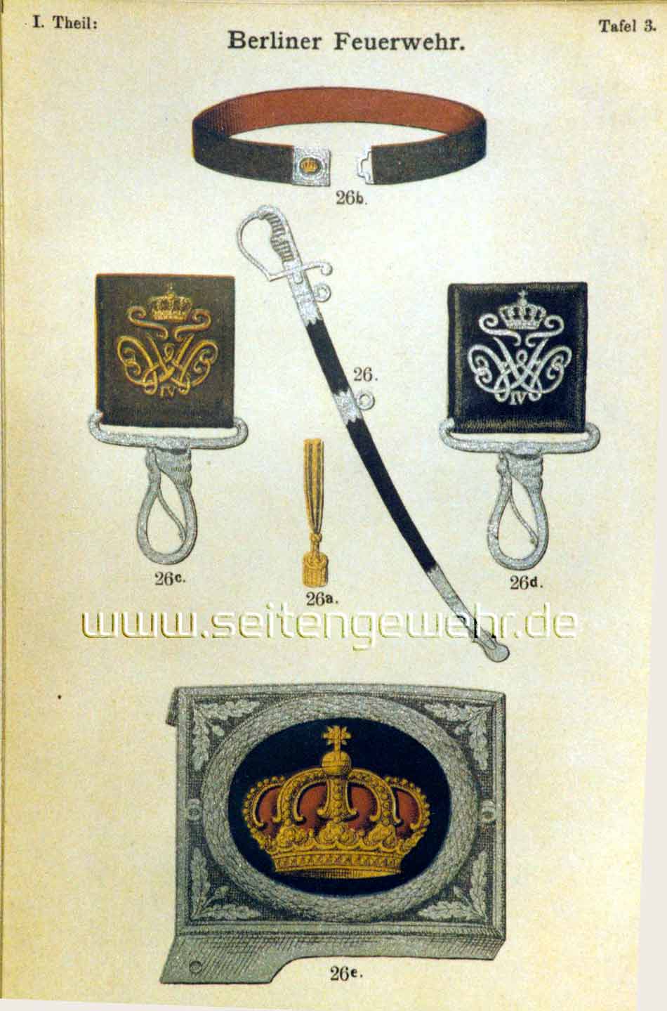 7 & 8: Seitengewehr, Portepees und Troddel. Das Band des Portepees ist blau durchzogen; der Feldwebel hat den Säbel und das Wehrgehänge wie Offiziere; Oberfeuerwehrmänner tragen das Seitengewehr an schwarzledernem Koppel mit Schloss aus weißem Metall.