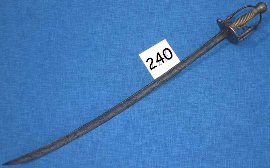Eisernes Korbgefäß mit Terz-,Griff- und abgesetztem Quartbügel mit Daumenring - alle mit Ziernodien - die an dem gedrungenen, runden Ballanceknauf verschraubt sind; flache Vernietung. Aus dem Mitteleisen läuft eine kurze abw. geb. Parierstange mit spitz gestauchtem Ende. Zwei versch. große Parierringe sitzen horizontal auf dem Mitteleisen und tragen quarts. den Daumenbügel und terzs. den Terzbügel. Sie sind mit gelochten Kacheln ausgelegt. D