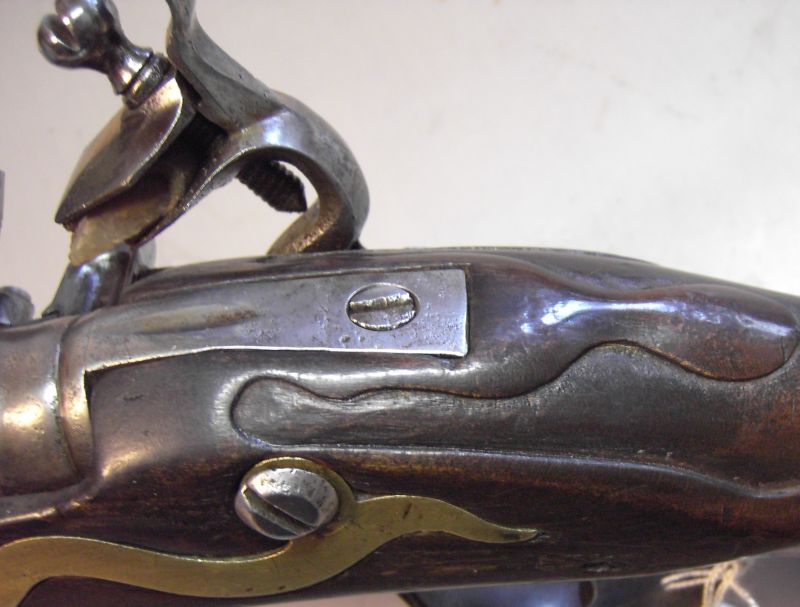 Kavalleriepistole 1789, Fertigung Gewehrfabrik Potsdam unter Leitung der Gebrüder Schickler[I]Dunkler Nussbaum-Vollschaft ohne Ladestocknut. Messingbeschläge, diese bestehend aus halbem Vorderschaftband, Abzugsbügel, seitlich flachgedrückter Kolbenkappe mit angedeuteten seitlichen Sporen und viereckigem Kolbennagel sowie flachem, bündig in das Schaftholz verlegtem Schlossgegenblech für zwei Schrauben. An der rechten Seite der Kolbenkappe das Herrschermonogramm „FWR[I]“ unter Krone. An der kolbenseitigen Verlängerung des Abzugsbügels die Kontrollmarke „