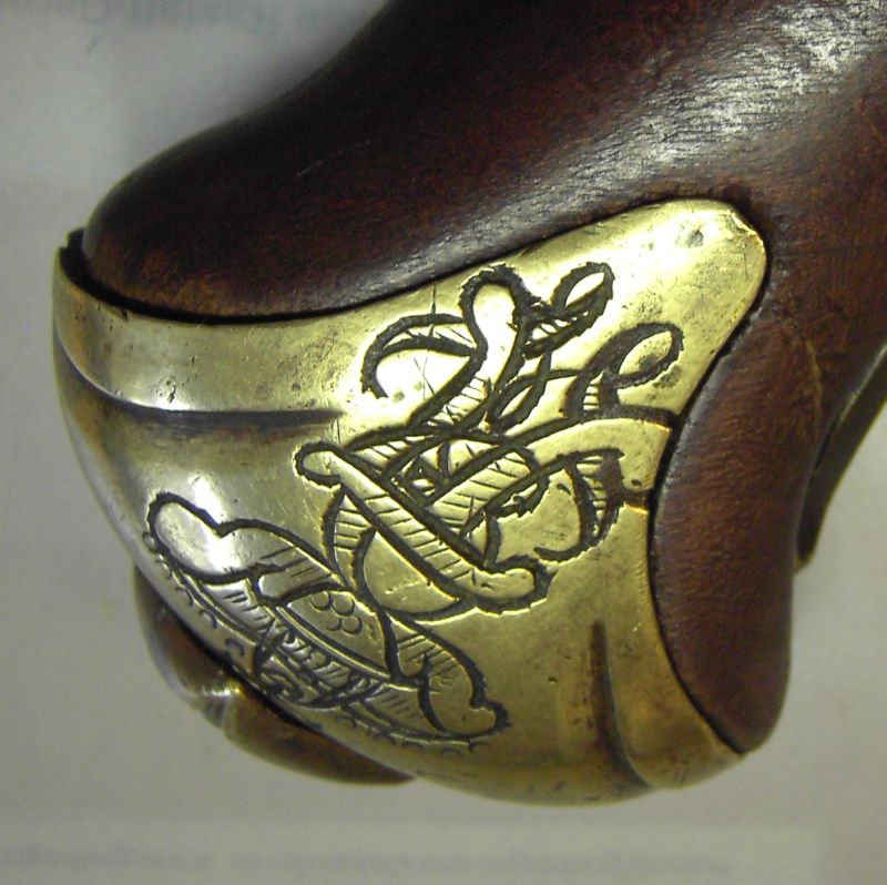 Kavalleriepistole 1789, Fertigung Gewehrfabrik Potsdam unter Leitung der Gebrüder Schickler[I]Dunkler Nussbaum-Vollschaft ohne Ladestocknut. Messingbeschläge, diese bestehend aus halbem Vorderschaftband, Abzugsbügel, seitlich flachgedrückter Kolbenkappe mit angedeuteten seitlichen Sporen und viereckigem Kolbennagel sowie flachem, bündig in das Schaftholz verlegtem Schlossgegenblech für zwei Schrauben. An der rechten Seite der Kolbenkappe das Herrschermonogramm „FWR[I]“ unter Krone. An der kolbenseitigen Verlängerung des Abzugsbügels die Kontrollmarke „N“ unter Kleeblatt des Fabrikenkommisars Nortmann aus Potsdam. Steinschloss 1789 mit Herstellersignatur „POTZDAMMAGAZ“ und „G.S.“ an der unteren Schrägkante des Schlossblechs. Runder, am Pulversack zweifach kanellierter Lauf mit Messingkorn, 30mm hinter der Mündung. Eingefeilte Kimme im Schwanzschraubenblatt, dieses endet gerade. Konisches Zündloch mit gestollter Schwanzschraube. Eine nicht bekannte Marke „L“ an der Laufunterseite. Schlossschrauben mit abgeschrägten Kanten an den Köpfen.