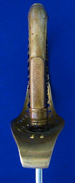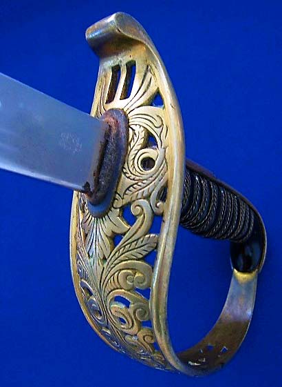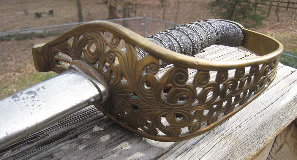 Here’s another m1854 Hessian infantry officer sword. The blade is single-fullered and is etched with floral sprays, military trophies, and a Reichsadler. The blade bears the stamp of W. R. Kirschbaum of Solingen and the spine is etched with “F. KUHNE SEN. GIESSEN,” who I presume was the retailer. I am told that that “sen.” is a common abbreviation for “senior” in German, so perhaps there was a younger F. Kuhne in the same business. One source lists an Edward Kühne as a retailer in Erfurt from 1870 through 1900. Perhaps a relation?