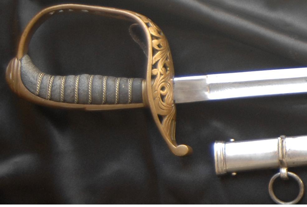 The scabbard is nickel-plated steel with two suspension bands, of which only the upper band is equipped with a ring. The lower band shows that the ring has been cut off to conform with the 1910 regulations.