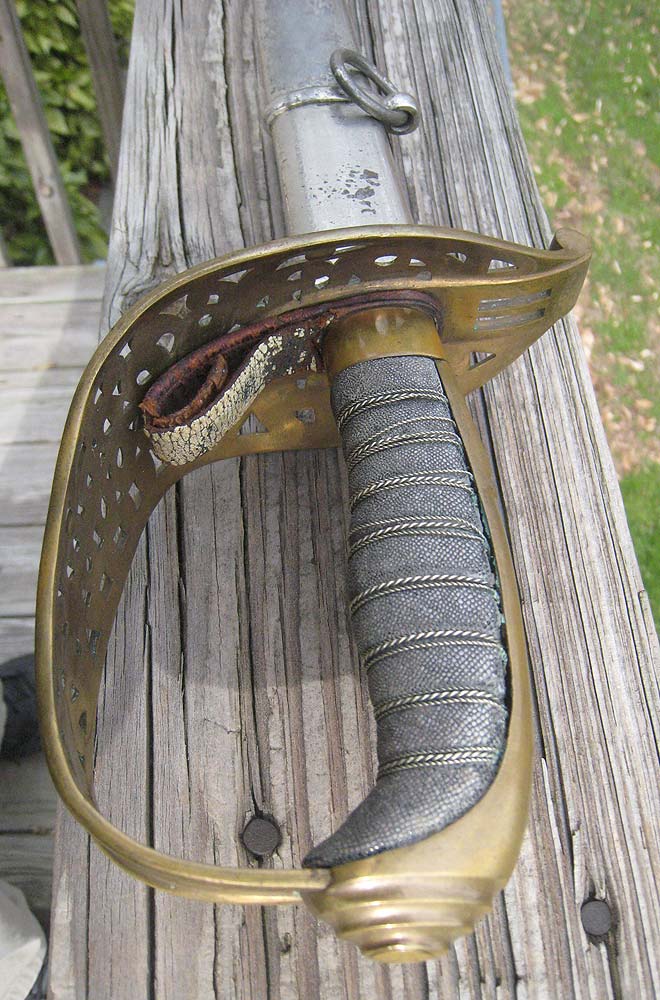 The scabbard is nickel-plated steel with two suspension bands, of which only the upper band is equipped with a ring. The lower band shows that the ring has been cut off to conform with the 1910 regulations.