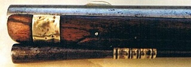 Nussbaum-Vollschaft mit runden Verschneidungen um das Schwanzschraubenblatt, das Schlossblech und das Schlossgegenblech. Messingbeschläge, diese bestehend aus halbem Vorderschaftband, zwei stark kanellierten Ladestockröhrchen, einteiligem Abzugsbügel mit vorderer und hinterer Verlängerung, Kolbenkappe mit langen, seitlichen Sporen, ausgeprägtem, rundem Nagel und Schlossgegenblech in der für die Zeit typischen Schlangenform und wappenförmigem Daumenblech mit aufgesetzter Krone und Herrscherchiffre