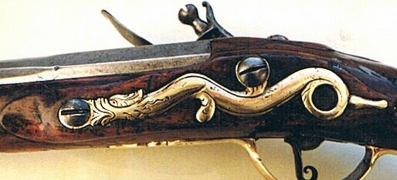 Nussbaum-Vollschaft mit runden Verschneidungen um das Schwanzschraubenblatt, das Schlossblech und das Schlossgegenblech. Messingbeschläge, diese bestehend aus halbem Vorderschaftband, zwei stark kanellierten Ladestockröhrchen, einteiligem Abzugsbügel mit vorderer und hinterer Verlängerung, Kolbenkappe mit langen, seitlichen Sporen, ausgeprägtem, rundem Nagel und Schlossgegenblech in der für die Zeit typischen Schlangenform und wappenförmigem Daumenblech mit aufgesetzter Krone und Herrscherchiffre