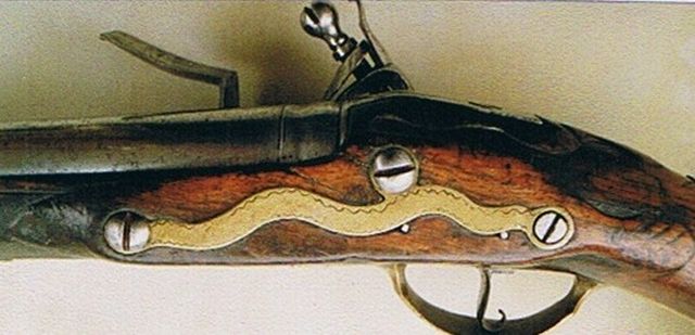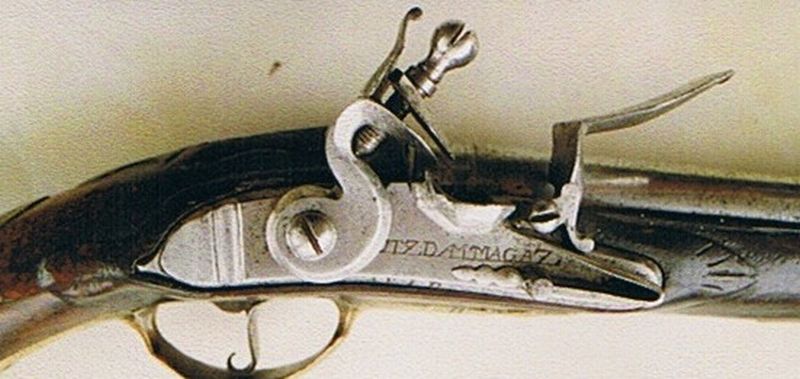 Die hier gezeigte, in späterer Zeit um 20mm gekürzte Pistole ist, wie das Herrscher-Monogramm „FR“ auf ihrem Daumenblech beweist, noch in der Reiterei Friedrichs des Großen verwendet worden. Nach dem Regierungswechsel im Jahre 1740 hat man sein Signum neu eingraviert, nachdem das alte Monogramm „FWR“ abgeschliffen worden war.