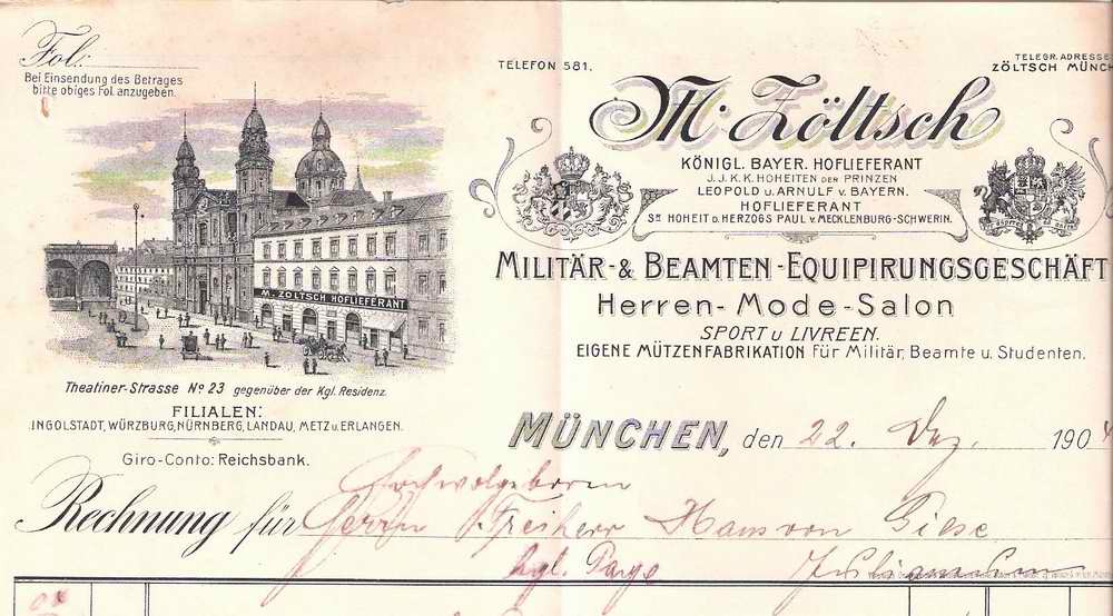 Die Rechnung über Uniformteile stammt aus dem Jahr 1904 und ist ausgestellt von M. Zöltsch, Militär- & Beamten-Equipirungsgeschäft, Herren-Mode-Salon, Sport und Livreen, Eigene Mützenfabrikation für Militär, Beamte und Studenten.
