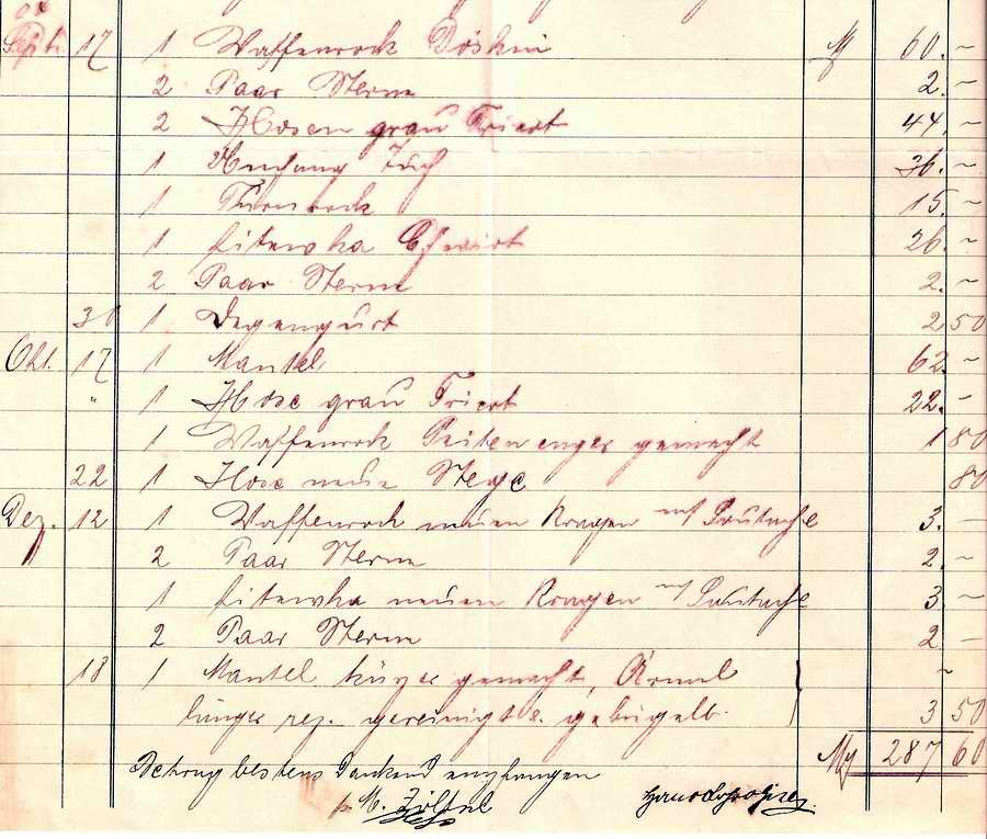 Soweit ich das überschaue, sind in einem Quartal 287,60 Mark für Hosen, Mäntel, Waffenröcke, Sterne(?), Litewken etc. ausgegeben worden. Teilweise handelt es sich um Änderungen, vielleicht auch Reparaturen.
