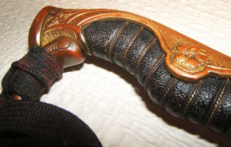 Die japanische Polizei wurde zeitgleich mit dem Heer reformiert, deren Säbel waren ebenfalls europäischen Vorbildern nachempfunden. Die unteren Ränge trugen meines Wissens nur kurze, etwa der Länge eines Wakizashi entsprechende Waffen mit differierenden Griffformen, die allerdings kein Parade – Äquivalent hatten. Bei den höheren Dienstgraden fand sich wieder die vom Heer bekannte Dienstsäbel / Paradesäbel – Teilung. Flüchtig betrachtet, waren diese tatsächlich den Heereswaffen ähnlich, die Ornamentik des Griffrückens unterschied sich allerdings, ebenso wie die schon von Dir erwähnte Darstellung der Blüten (10 Blütenblätter – Heer / 5 – Polizei und Marine). Dies betraf sowohl die Blüten des Gefäßes als auch die der Griffseiten. Ebenso verfügen auch die Paradesäbel der Polizei über eine Arretierung – die Dienstwaffen ohnehin. (Bilder 1 + 2)