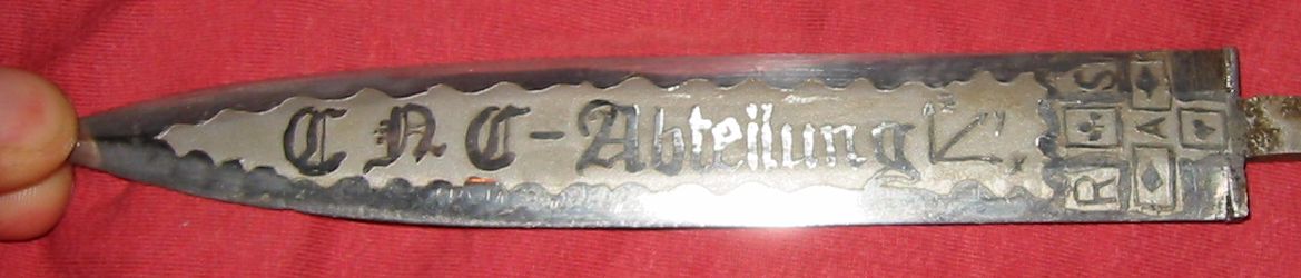 Da ich kein Sütterlin auf dem Rechner hatte, nahm ich Old English und druckte mir ein paar Zeilen in verschiedenen Größen aus. Mit einem feinen Pinsel malte ich frei Hand die Schrift auf die entfettete Klinge. Ich nahm Asphaltlack und als Säure ein Gemisch aus Salpeter und Salzsäure (ich hatte es halt eilig bitte, bitte nicht nachmachen, es entstehengiftige Gase, die Lungenschäden verursachen können!!!.