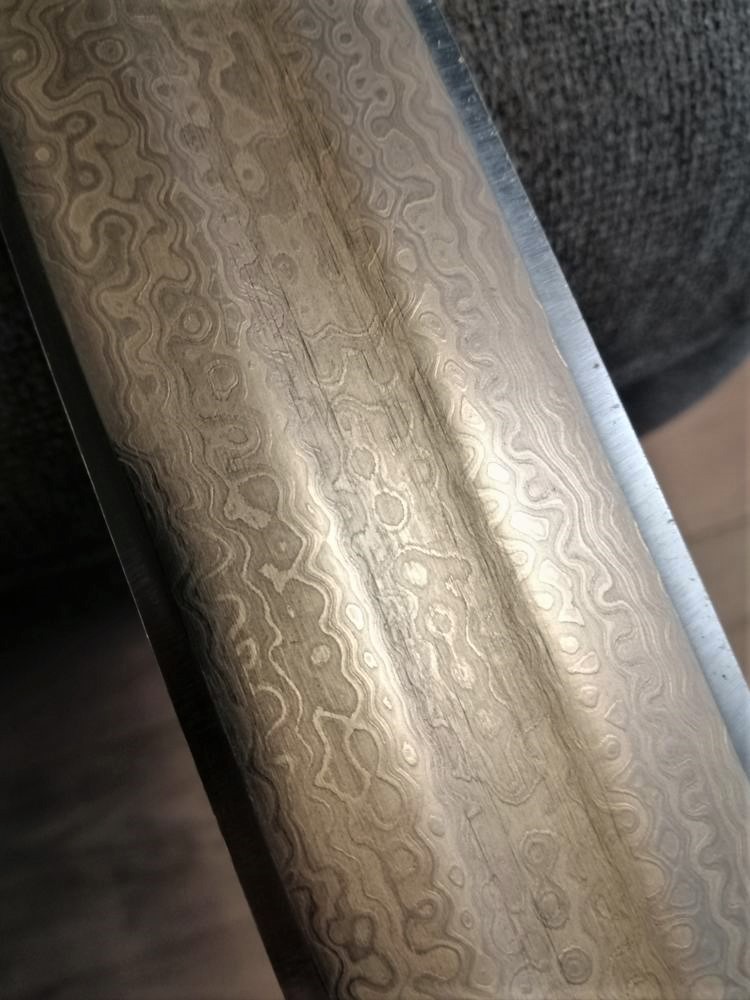 Ein komplett anderes Verfahren ist der herstellung von "richtiges Damaststahl". Ich glaube es ist auch bekannt unter den nahmen Wootz und wird hergestellt durch das über langer Zeit herausgezögern der Abkühlung eines Stahlgusses. Das typische Damast oder Wootz Bild im Stahl ensteht dur eine Zahl von kleine Verunreinigungen wobei Vanadium einer grosse Rolle spielt. Es sorgt für die bildung von so zu sagen harte "Strangen" oder "Nadeln" umringt mit weiches und mittelhartes Material. Also eigenschaften wie oben beschrieben aber hergestellt als ein mehr oder weniger "Monostahl". Dieser Verfahren war langer Zeit verschollen, ist aber vor nich zu langer Zeit wiederentdeckt.