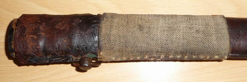 Bei dieser lederbezogenen Ausführung handelt es sich nicht um die Schutzmaßnahme der Scheide vor Schmutz im Felde, sondern ist eine Art Notausführung. Ersteres wurde bei den ursprünglichen Scheiden aus Metall gemacht. Im hier gezeigten Fall wurde das Metall der Scheide eingespart, aus Material- und Zeitnot.