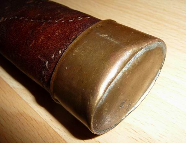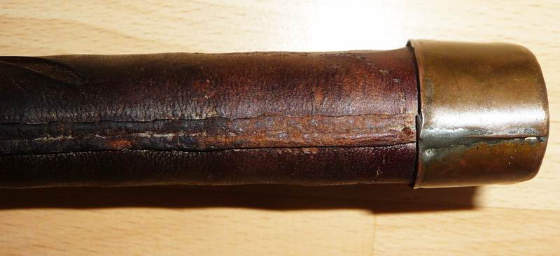 Besonders erwähnenswert sind die "Extras" an dieser Scheide, unter anderem die schon im vorangegangenen Beitrag gezeigte Ummantelung der Scheide mit einem Stück Leinen, auf Höhe der Stelle, an der die Hand des Trägers üblicherweise hinfäßt, um das Schwert im verwahrtem Zustand zu transportieren. Desweiteren ist der Scheidenort mit einem unüblichen Ortblech versehen. Das wurde entweder vom Träger zusätzlich montiert, oder ist eine nicht vorgeschriebene "Zusatzleistung" vom Hersteller. Seinen Zweck dürfte dieses Extra erfüllt haben, sind doch die meisten lederbezogenen Scheiden am Ort defekt.