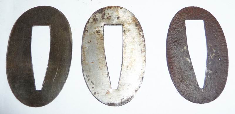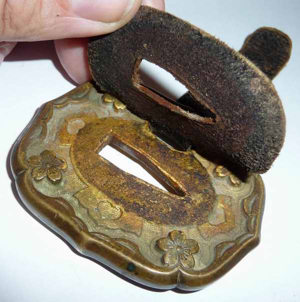 Ebenso fehlt die federbelastete Klinke, die Schwert und Scheide üblicherweise zusammenhält. Statt dessen geht ein Lederriemen mit Druckknopf durch eine Öffnung der Tsuba hindurch, um diesen dann im verwahrten Zustand mit einem Gegenknopf an der Scheide zu verbinden.