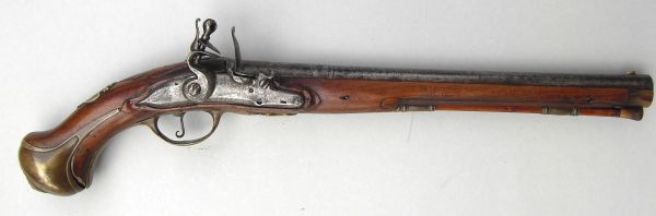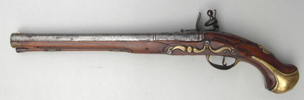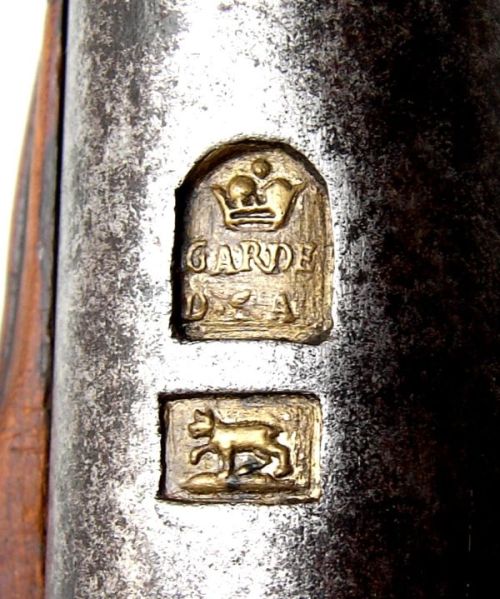Nussbaum-Vollschaft mit Hornabschluss am Vorderschaft. Messingbeschläge, diese bestehend aus zwei Ladestockröhrchen, Abzugsbügel, Kolbenkappe mit langen seitlichen Sporen, Schlossgegenblech für drei Schrauben und Daumenblech mit dem bekrönten und ligierten Monogramm „EL“ von Landgraf Ernst Ludwig (1678-1739) von Hessen-Darmstadt. Auf der gesamten Länge runder Lauf mit Kanellierungen am Laufende und im hinteren Laufviertel. Kimme in das Schwanzschraubenblatt eingefeilt, Messingkorn auf dem Lauf, 11mm hinter der Mündung. Zwischen den beiden Kanellierungen eine goldeingelegte Marke „Krone über GARDE / D S A“ =