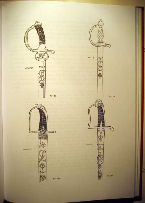 Anmerkung: Darstellung von 54 dänischen Blankwaffen aus der Zeit von 1701 bis 1808. Zeichnungen von Gefäß mit oberem Klingendrittel mit Gravuren sowie Klingenquerschnitt. Beschreibung der Waffen und eventueller Varianten sowie Hinweise über Hersteller, Anzahl, Verwendung usw.