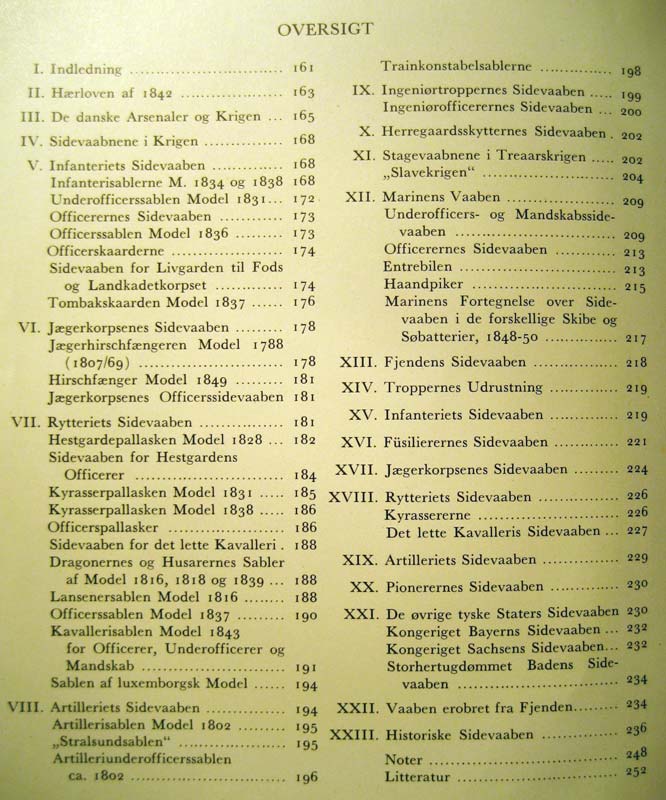 Anmerkung: In diesem Werk werden 204 dänische Seitenwaffen aus der Zeit von 1600 bis 1966 vorgestellt. Fast alle Waffen werden mit einem Bild vom Gefäß und in ihrer Gesamtheit gezeigt. Das Werk ist in dänischer Sprache verfaßt hat aber im Anhang zu jeder Waffe eine Kurzbeschreibung und/oder Aussagen zu ihrer Geschichte.