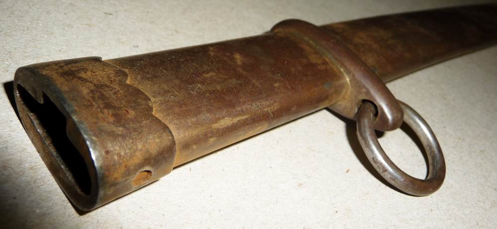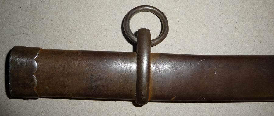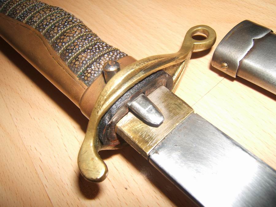 Der Säbel wird, wie bei den meisten japanischen Blankwaffen nach der Zeit der Samurai, mit einer Verriegelung in der Scheide gehalten. Die Scheide hat ein am Rand gewelltes Mundblech, sowie ein stromlinienförmiges Band.