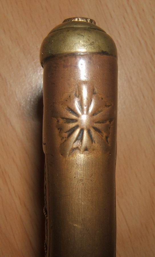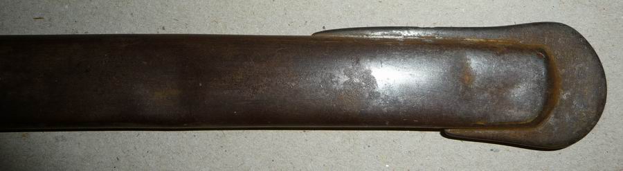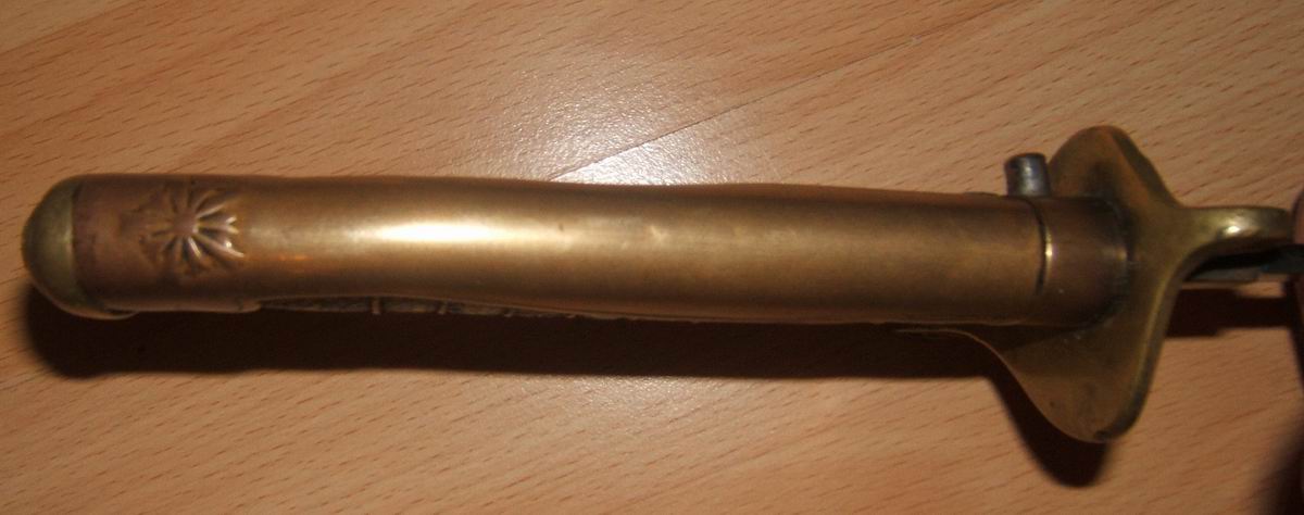Auf der Seite 308 und Seite 309 Absatz 1 wird nun dieses Stück beschrieben. Im Unterschied zum oben gezeigten ist die Griffkappe nicht verziert. Das Polizeiabzeichen fehlt und die Angelschraube ist in der Form einer fünfblättrigen Kirschblüte, welche auch bei anderen Säbeln die Zugehörigkeit zur Polizei anzeigt. Die Kirschblüte der Armee ist zehnblättrig.