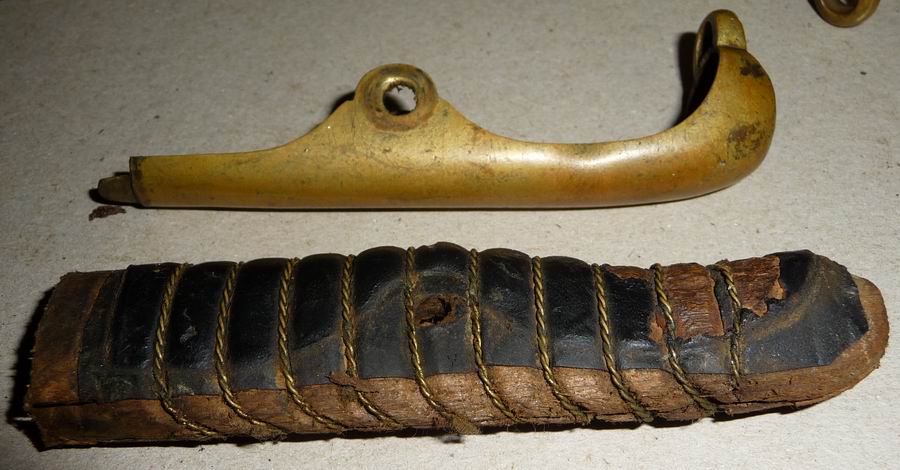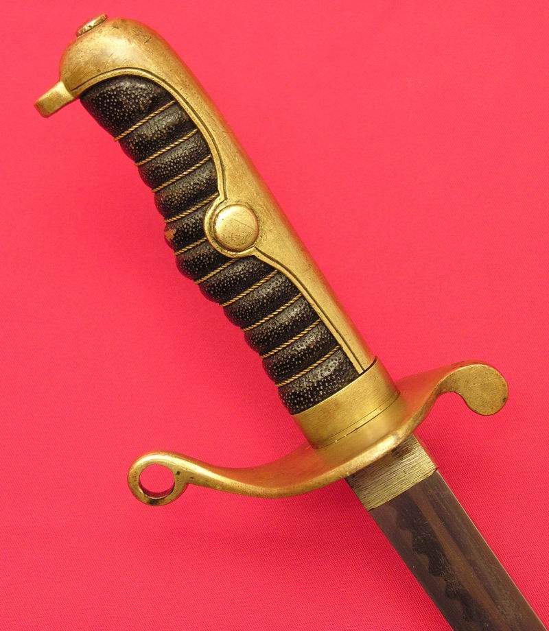 Griff mit Rochenhaut bezogen. Durch die runden Aussparungen in der Griffkappe und dem Stichblattende wurde ein Faustriemen/Portepee gezogen.
