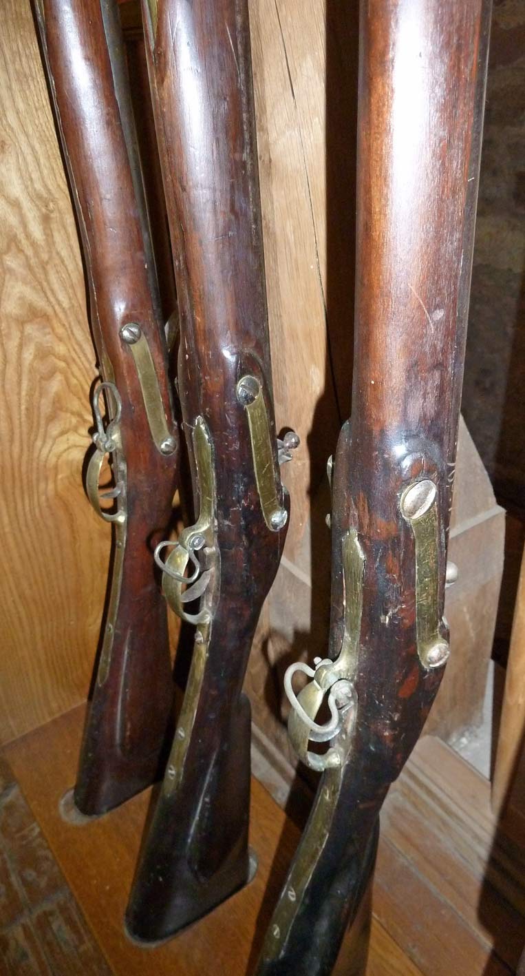3 Steinschloß Infanteriegewehre gleichen Musters mit Bajonett. Hier könnte sich eine nähere Bestimmung lohnen.