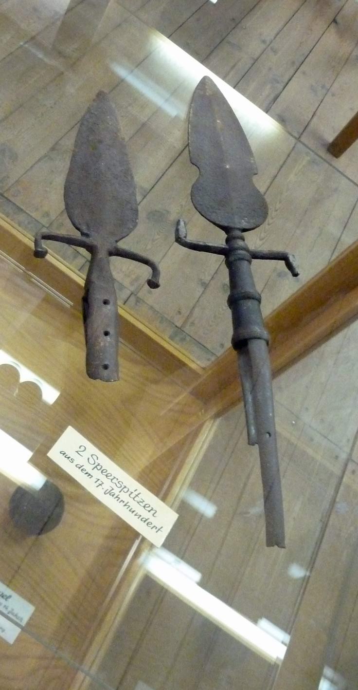 Stangenwaffen: Pike, zwei Spießeisen und zwei (?) Spontone. Das rechte Sponton - der Knebel wurde leider recht verhunzt - könnte durchaus Teil einer ehemals hessischen Offiziersbewaffnung gewesen sein. Ob sich unter dem Rost auf dem Blatt noch eine Gravur oder Ätzung befindet, war leider nicht auszumachen.