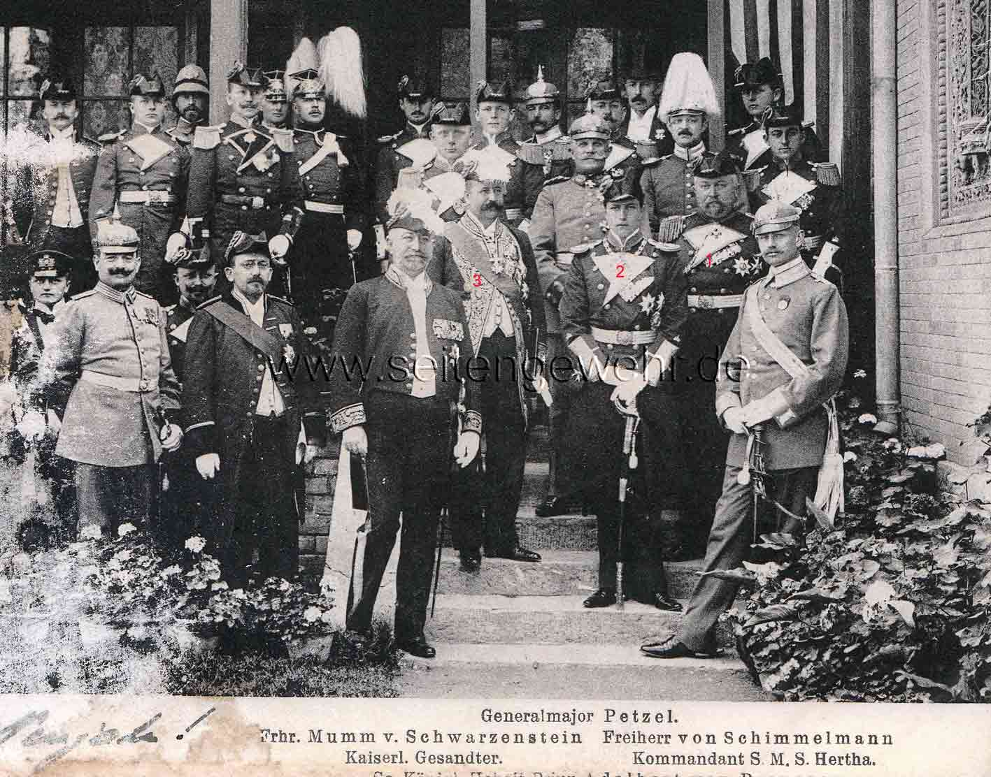 Aufnahme um den 17. Mai 1904 aus Tientsin oder Peking. Freiherr Malte von Schimmelmann (1), Kommandant SMS Hertha, sowie der an Bord dienstleistende Prinz Adalbert von Preussen (2) vor dessen Audienz am Kaiserhof ( 17. Mai 1904). Sehenswert auch die Uniform des kaiserlichen Gesandten in Peking Freiherr Alfons Mumm von Schwarzenstein (3). Dahinter der Kommandeur der Ostasiatischen Besatzungsbrigade Generalmajor Eugen von Petzel.