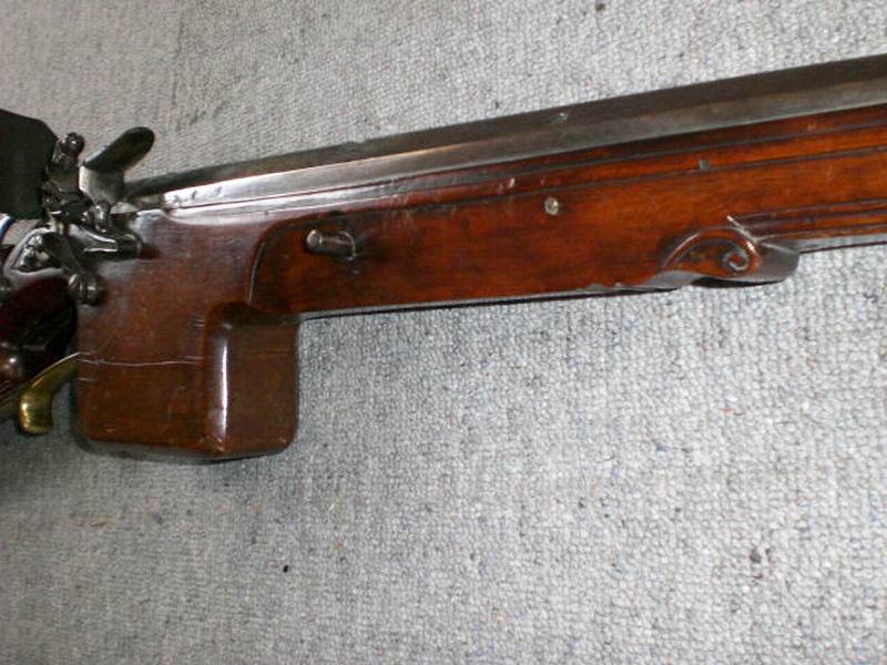 Ein ähnliches Gewehr wurde um 1740 von Muck aus Brinn (Österreich) hergestellt, auch aus Obstholz. Der Klotz am Abzungsbügel ist vermutlich eine Handstütze wie es bei jüngeren Büchsen üblich ist.