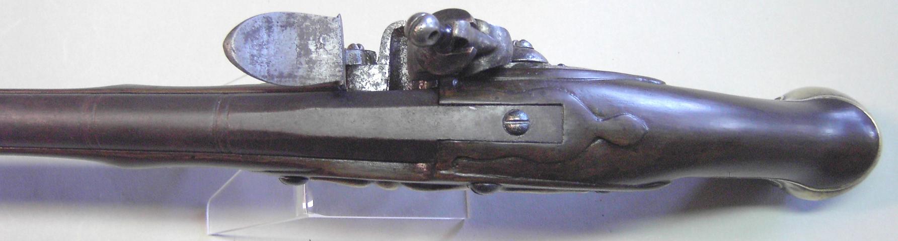 Die nach Aussage der Marke an der Laufunterseite von Johann Jakob Behr gefertigte Pistole besitzt ein Schlossgegenblech, welches in dieser charakteristischen Ausformung bei anderen Truppenkontingenten nicht nachgewiesen werden kann und somit die Zuschreibung des Stückes zur Landgrafschaft Hessen zulässig erscheint. Eine ziemlich genaue zeitliche Zuordnung der Dragonerpistole kann an einem sehr charakteristischen Detail der Laufgestaltung festgemacht werden: Zwischen dem hinteren Achtkantteil des Laufs und dem runden Vorderteil befindet sich ein etwa 28mm langes, sechszehnkantiges Stück, dem sich ein Ballusterring anschließt. Danach ist der Lauf rund ausgeformt. Dieser vielkantige Laufteil ist kennzeichnend für Waffen aus der Zeit des Übergangs von 17. zum 18. Jahrhundert, also der Zeit etwa zwischen 1695 bis 1710.