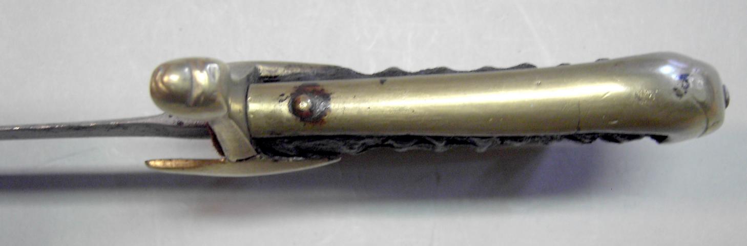 Der Nagel, mit dem die Griffkappe an der Hilze befestigt ist, kommt nach meiner Kenntnis hauptsächlich an österreichischen, aber auch bayerischen Blankwaffen vor. Jedoch konnte ich bisher keinen entsprechenden Nachweis für diesen Typ Waffe finden.