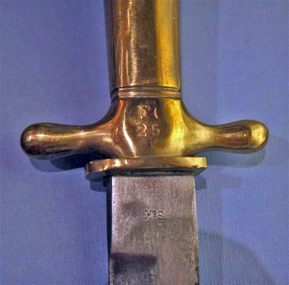 Hier ein Hirschfänger M 1810, ist unter anderem auch mit FG 25 gestempelt, leider ist der Griff verputzt und somit schlecht leserlich (auch sind meine Fotokünste nicht so gut).