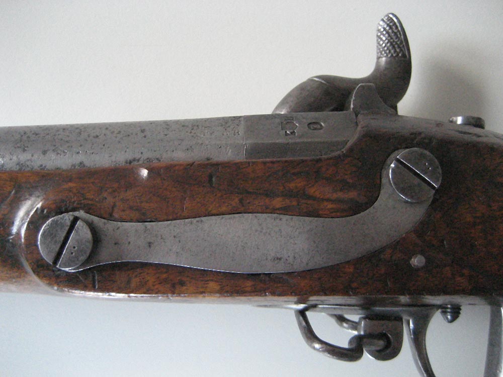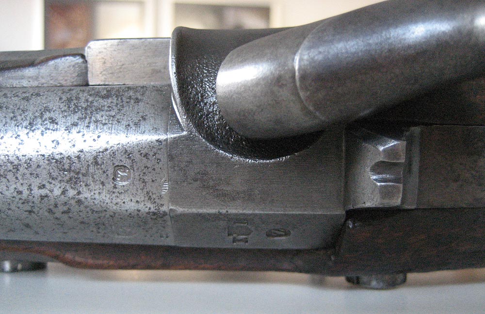 Auf der Unterseite des Laufes ist eine Zahl, im Stil der Zahlen auf den Ladestock, graviert: Eine 3 oder 8 meine ich zu erkennen. Am unterseitigen Markierungsstrich Schwanzschraube - Lauf ist ein "M" gestempelt. Auf dem mittleren und vorderen Laufring ein "L". Die Riemenöse am Handschutz scheint alt ersetzt.