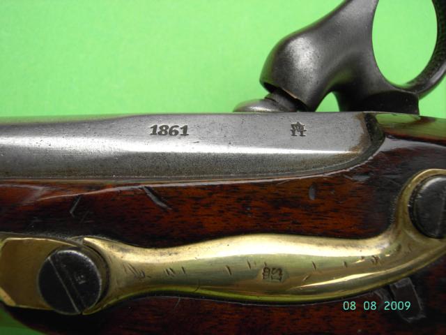 Nussbaumschaft mit Messingbeschlägen, diese bestehend aus doppelbündigem Laufring mit Verbindungssteg zur vorderen Schlossschraube, Gegenblech, Kolbenkappe und Abzugsbügel mit Einhakmontage. Eiserner Kolbenoberbügel und Unterbügel mit integriertem Abzugsblech. Runder, am Pulversack kantiger Lauf mit Pistonhöcker. Fertigungsjahr „1861“ an der linken Laufseite oben. Modellbezeichnung „M 1850“ auf dem Schwanzschraubenblatt. Eiserner Ladestock mit nagelförmigem Kopf an Scharnier, dieses mit Fixpunkt an der Laufunterseite, 7mm hinter der Mündung. Neugefertigtes Perkussionsschloss mit gewölbtem Ringhahn. Kontrollstempel „LT“ unter Krone über „60“ auf dem Schlossblech. „T“ unter Krone im Oval auf dem Lauf. „Delft 1861“ und „W“ im Kreis am Schaft links. Gesamtlänge 365mm, Lauflänge 210mm, Kaliber des glatten Laufs 17,0mm, Länge des Schlossblechs 128mm.