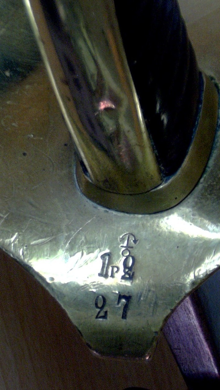 Krone auf der Klinge = militärische Abnahme 12 (überstempelt von PS) über 27 auf dem Gefäß = leider nicht zu deuten, jedoch alter Kavalleriestempel.