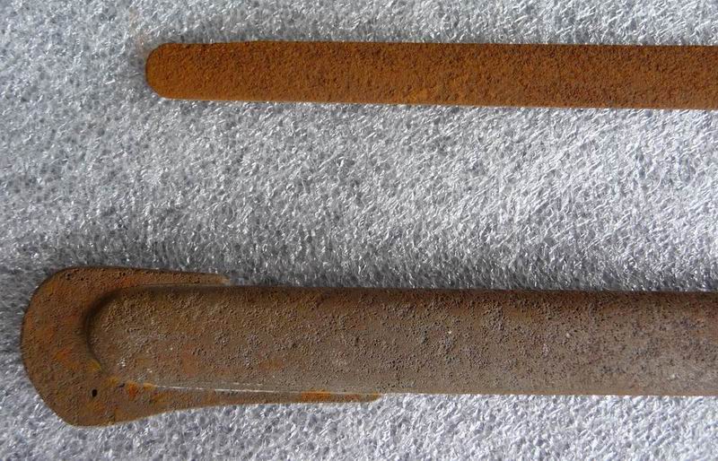 Die leicht gekrümmte Klinge mit Mittelgrat ist zweischneidig, stumpf und hat einen abgerundeten Ort.