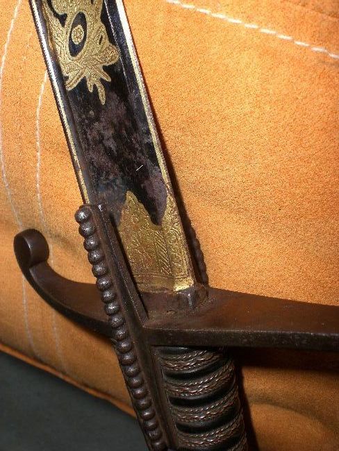 Ich möchte dem Forum gerne, den von mir kürzlich erworbenen o. g. Säbel, zur Ansicht vorstellen. Der ehem. Besitzer dieses Säbels ( auf der Klinge lesbar ), war Wimar Söntgerath, geb. 1773 auf dem Schemkershofe zu Inger bei Birk. W. S. starb am 18.01.1837 auf dem Quadenhofe und war unverehelicht. Eine Chronik des Hofes Rietschoß bei Honnef berichtet uns folgendes: Wimar Söntgerath war ein Bauernsohn, der im Streit mit seinen Eltern in den damals unruhigen Zeiten, zu den Soldaten gegangen und " mit den Oesterreichern retitiert " war und es dann zum Offizier gebracht hatte, er starb als Premirlieutnant a. D. Nun zum Säbel selbst. Der Säbel mit gebläuter Klinge u. vergoldeten unterschiedlichen Darstellungen, siehe Photos, hat ein Eisengefäß, dessen Griffbügel mit einem Perlenschnurdekor belegt ist, unterbrochen von einem Medaillon mit überkröntem Adler.Die Parierlappen sind ebenf. mit einem Perlenschnurdekor belegt, die Parierstange n. vorn geneigt mit rundem Abschluß. Die Griffhilze aus Leder / Horn ? ist mit zweifachem Kupferdraht verdrillt. Der Griffkappenvernietung ist Rautenförmig u. ungeöffnet.Der nicht gebläute Klingenabschnitt ist nicht poliert, sondern weißfarben mattiert u. beiderseits, mit mit jeweils im Wechsel durch 4 Blüten u. 4 Rauten, diese bestehend aus 9 Punkten verziert, die Klingenspitze ist hechtzungenförmig. Quartseitig, die Figur über dem Adler gleicht einem Engel. Die Scheide mit 2 Bändern u. 2 bewegl. Ringen versehen, deren Befestigungen zehnkantig gearbeitet sind. Die Maße des Säbels: Gesamtlänge 102.5 cm. Klingenlänge 86.5 cm. Klingenbreite 3.00 cm. Scheidenl. 90 cm. Für jede Unterstützung bezügl. einer genaueren Zuordnung wäre ich dankbar... Gruß, Sonjar