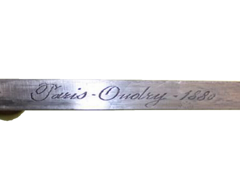 Herstellerbezeichnung und Datum 'L.Deny Paris 1877' auf dem Klingenrücken