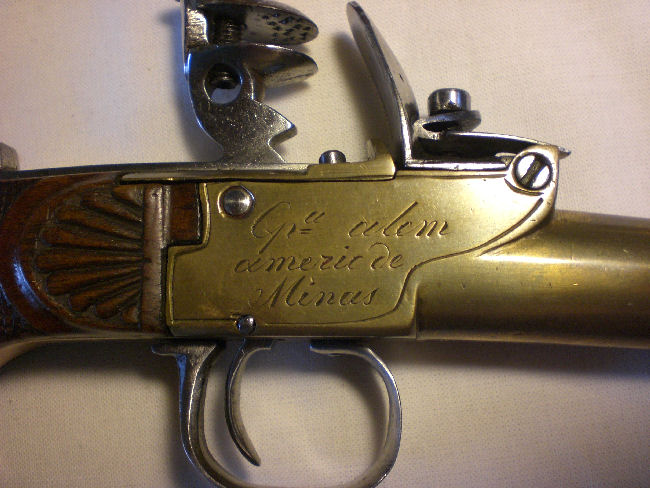 Knackpunkt ist die Schlosskastensignatur an der Steinschlosspistole. Das "Cp" mit dem hochgestellten "u" steht sicherlich nicht für Capitaine, sondern eher für ein portugiesisch/brasilianisches "Captivu" o.ä., woraus man davon ausgehen könnte, dass es sich vielleicht um eine Erinnerungssignatur, etwa "erbeutet im amerikanischen Minas" handeln könnte. Da beide Pistolen aus Messing gegossen sind, spricht dies mit großer Wahrscheinlichkeit wenn auch nicht zwangsläufig für deren Verwendung auf See.