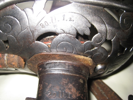 Interessant sind die Sichtungsnummern auf der Fehlschärfe „22 85 Z“. Es könnte sich hierbei um die 1922 erfolgte Registrierung von Blankwaffen außerhalb des Militärs handeln. Also Polizeiwehr, Schutzpolizei, Landjäger Kommunalpolizei, Zoll etc. Demnach die registrierte Waffe Nr. 85. Die Erklärung des „Z“ bleibt spekulativ: Zoll, Zeughaus oder auch eine Kommune, bei der der Name mit Z beginnt. Wobei gerade in der Nachkriegszeit der Säbel nicht zwangsläufig im Freistaat Württemberg gelandet sein muß.