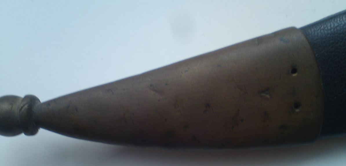 ich habe einen säbelähnlichen Gegenstand von meinem Opa erhalten, der diesen aber selbst vor Jahrzehnten geschenkt bekommen hat. Was er mir sagen konnte ist, dass er die Scheide neu beschlagen lassen hat, da die richtige Lederhülle wohl sehr ´zerfetzt´ war. Der neue Überzug besteht aus Kunstleder.