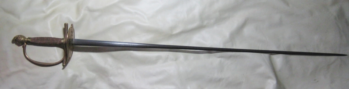 Ich denke es handelt sich auf Grund des Ritterhelmknaufs, um einen Französischen Degen um ca.1790. Ich würde mich freuen, wenn mir jemand genaueres zu dem Degen sagen könnte (z.B. Modelbezeichnung, Verwendung militäri. oder Zivil, Alter).