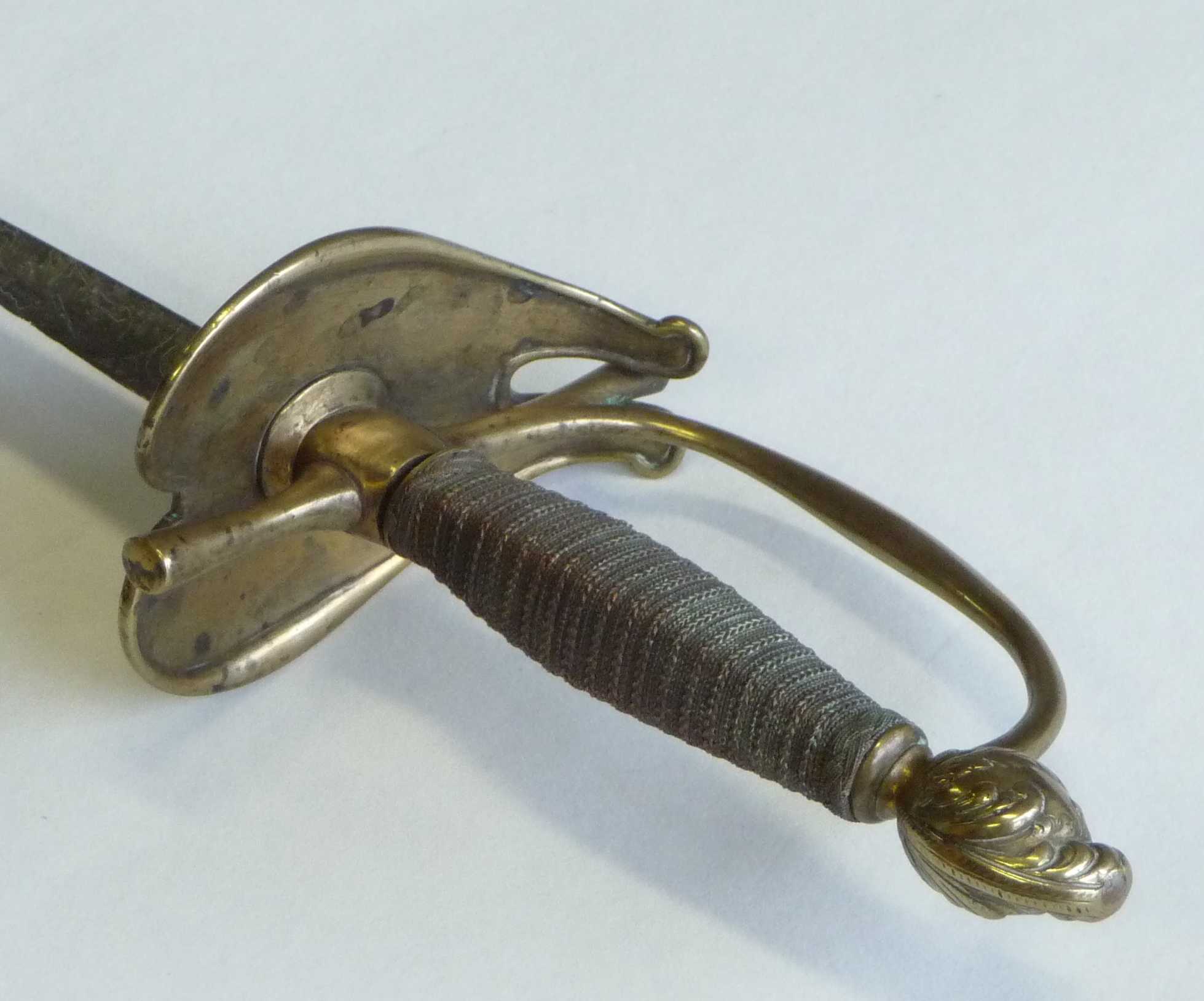 Griff in Messing montiert mit Griffknauf in Form eines Ritterhelmes, herzförmiges Stichblatt nach hinten geschweift, Griffhilze mit gedrilltem Kupferdraht. Zweischneidige Klinge mit Mittelgrat.